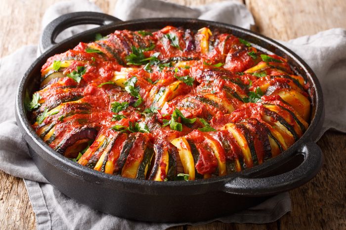 Kleurrijke Griekse briam met aubergine, courgette en aardappelen