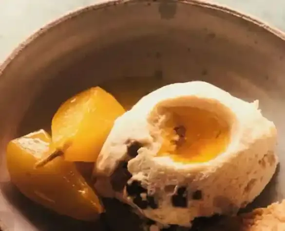 Honingmousse met pijnboompitten praliné en kruidige peren